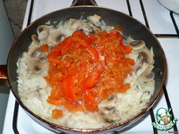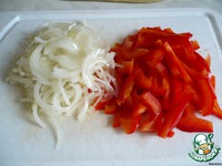 2. Лук нарезать полукольцами, перец соломкой. На сковороде обжарить лук в течение 3 минут. Добавить перец и жарить еще 5 минут. |