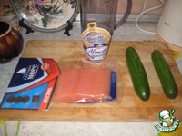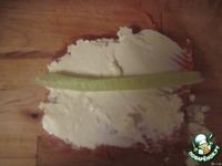 Режем огурцы. Один соломкой, второй кружочками. Рыбу режем пластинками. На рыбу толстым слоем намазываем сыр. |