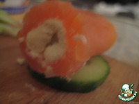 Кладем на получившейся бутерброд огуречную соломинку и подрезаем её по размеру рыбы. Скатываем. Разрезаем на три части. Не бойтесь, если ролл расклеился. |