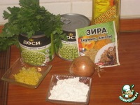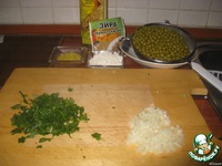 Горошек откидываем на дуршлаг, лук и зелень режем. |