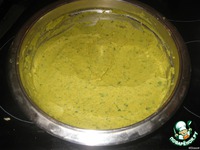 В миску кладем горошек, зелень, лук и чеснок и все хорошо смалываем блендером, получаем вот такую массу. |