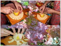 Оплетаем наше нафаршированное яблоко, так, как плетут корзины… Выкладываем получившуюся корзинку на противень смазанный маслом или жиром и присыпаем верхушки натертым сыром, твердых или полутвердых сортов… Дальше проявляем небольшую кулинарную хитрость… Предварительно разогревам духовку до 350-400 гр. С… Ставим в духовку противень с нашими корзинками с яблоками на пару минут, так, чтобы расплавился сыр и у выпечки слегка образовалась корочка… Вынимаем наши изделия из духовки и тщательно, в 2-3 слоя смазываем поверхность взбитым яйцом. Теперь наружный слой нашей выпечки надежно укреплен и дальше дрожжевое тесто будет расширяться только вовнутрь выпечки, заполняя нежелательные пустоты. Даем остыть нашей духовке до 200-230 гр. С и отправляем в нее выпечку на35-40 минут до полной готовности … |