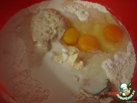В муке сделать углубление, вылить оставшееся молоко, добавить все по списку и вылить дрожжи, которые уже подошли. |
