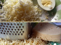 На мелкой терке трем вареные яйца и сыр (у меня был обычный "Звенигородский") - объем натертых компонентов примерно одинаков, но может варьироваться в пользу сыра). |