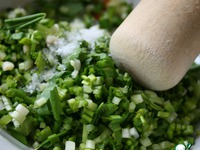 Черемшу режем мелко-мелко, да еще вдобавок разминаем с солью толкушкой, чтоб сок пустила. |