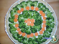 Украшаем брокколи и морковью, порезанной кружками. Заливаем соусом и ставим в духовку на 30 мин при температуре 180 градусов. |
