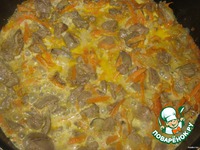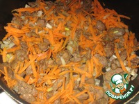 Куриную печень промыть, нарезать, обжарить на растительном масле. Добавить нарезанный лук и натёртую морковь. |