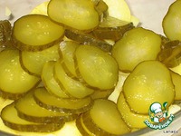 Слоями выложить картофель, маринованные огурцы кольцами, |