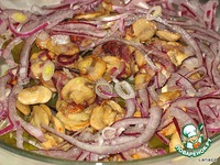оставшийся лук и грибы. Заправить растительным маслом, добавляя немного рассола. Любителям поострее - поперчить. Перемешать. Салат подать на листьях салата. |
