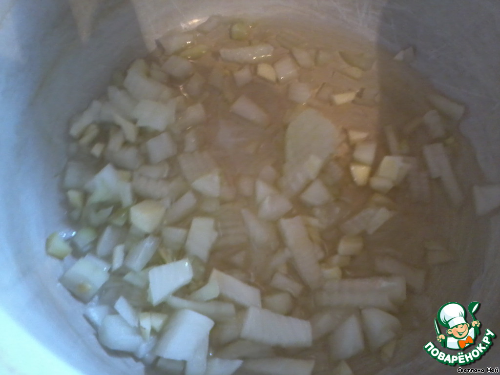 Лук и чеснок очистить, нарезать мелкими кубиками и припустить в глубокой кастрюле (в которой будете варить суп) |