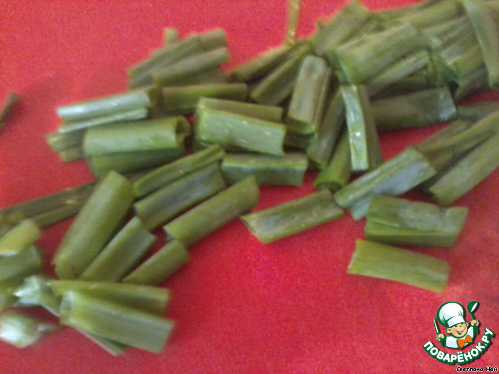 Зеленый лук нарезать полосками и отложить немного на украшение |