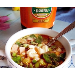 Всe разложить по тарелкам, добавить майонез (только на натуральных яйцах, я добавляю "Кальве" ) и залить квасом из пластиковой бутылки. Квас нужно брать только живого брожения, я беру "Николу", за остальной не отвечаю. Заливать немного - только, чтобы покрыть ингредиенты, но всe, конечно, зависит от Вашего вкуса.