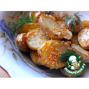 Описание: Молодой картофель, запеченный с чесноком и кунжутом со сметанным соусом. Поверьте, это очень вкусно! Рекомендую!