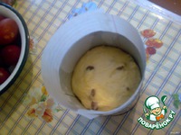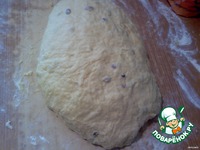 Добавить взбитые белки, еще муки, изюм. Месить тесто на столе, пока не перестанет приставать к рукам. |