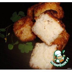Перед тем как пожарить, каждый кусочек обваляем сначала в муке, затем в яйце, затем в панировочных сухарях |