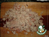 Из банки с ананасами слить сироп и дольки нарезать мелкими кусочками. |