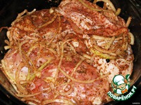 Маринуем бедра в смеси из соли, перца, специй и 1 головки репчатого лука (около 30-40мин). |