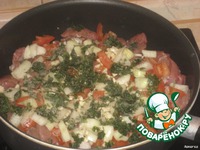 Выложить все ингридиенты в сотейник, посолить, поперчить, добавить зелень, сушеный базилик. |