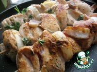 Разогреть масло в сковороде. Нанизать шашлычки следующим образом: кусочек филе наметочным движением, пластинка гриба, кольцо лука и т. д. |
