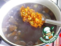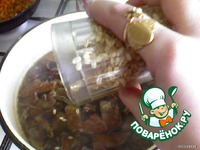 В уже почти готовые грибы всыпать крупу. Проварить минут 7-10. |