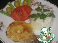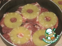 Сверху положить на каждый кусок мясо по 1 колечку ананаса. |
