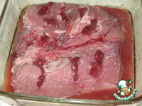 Снаружи мясо натираем вишневым соком, давленным чесноком, специями и кладем под гнет на 2-3 часа, оставив миску с мясом в кухне на столе.