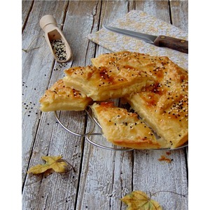 Раскатали 2-ю часть теста, положили сверху начинки. Соединили края. Я из обрезков теста сделала снеговика. Присыпать кунжутом. Пирог смазать желтком, снеговика смазала белком яйца. |