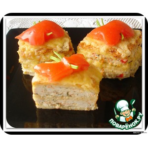 Запекать в предварительно разогретой духовке (200 град.) 30 мин, присыпать сыром, поставить опять в духовку на 5 мин. |
