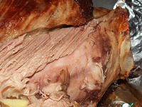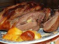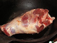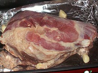 Затем выкладываем на противень, смазанный сливочным маслом (я по привычке обернула ногу фольгой – но с тем, чтобы потом фольгу можно было отвернуть с ноги!). Ставим в разогретую духовку при температуре 200-250 градусов.