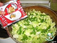 Далее вторую часть капусты, немного порезанного зеленого сельдерея и немного Вегеты. Добавляем немного воды и закрываем крышкой. Ставим на плиту и с момента закипания тушим 60-70 минут. |