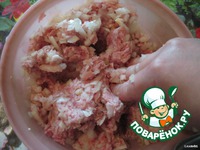 Смешать фарш с луком. Хорошо перемешать. Посолить, поперчить и подлить немного водички, чтобы фарш был мягким. |