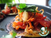 На противень выложить кружочки баклажана, на них - по ложке овощной начинки. |