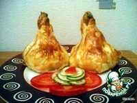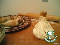 На квадрат из теста выложить начинку ~ 2-3 ст. ложки, установить посередине куриную голень. |