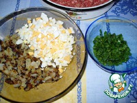 Яйца очистить мелко нарезать, зелень измельчить. Смешать яйца, зелень и лук, посолить. Я добавляю свой любимый соевый соус. |