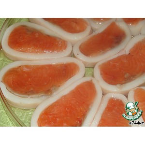 Теперь берем ломтик рыбки, вкладываем в внутрь кольца кальмара и выкладываем в судочек. |