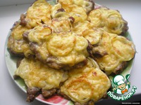сверху мясо посыпать тертым сыром, на противень налить слегка воды (чтобы мясо не пригорело) и запекать в духовке при температуре 180 градусов 20 мин. |
