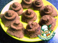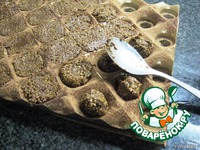 Форму смажьте каким-нибудь жиром, я пользовался кулинарным спреем, и присыпьте какао, мокрыми руками скатайте шарики, а потом ложкой хорошо спрессовать. |