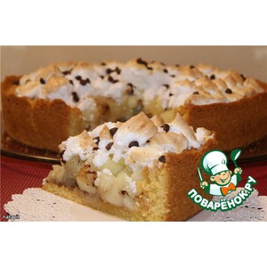 Взбить белки с сахаром и лимонной кислотой до устойчивых пиков и с помощью кулинарного кулька (шприца) отсадить безе по верху пирога. |