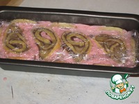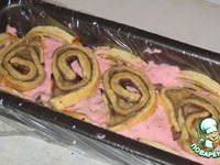 9. Форму выложить пищевой пленкой, на дно вылить немного, уже начинающей схватываться, заливки и выложить кусочки рулета в один слой. |
