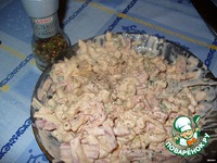 Описание: Предлагаю Вашему вниманию мой вариант ныне популярного салата. Как и все, попробовала в кафе, дома соорудила нечто подобное. Салат прост в приготовлении и пользуется заслуженной популярностью у гостей. Еще я его готовлю, когда остались отварные макароны.