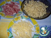 Ветчину и сыр нарезать тонкими полосками. Смешать с холодными отварными макаронами. |