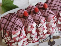Когда масса хорошо застынет, вынуть террин из формы, бока промазать малиновым джемом, |