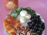 Приготовьте продукты: помойте курагу, чернослив, кинзу. Почистите лук. |