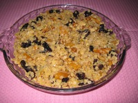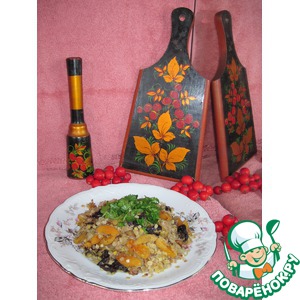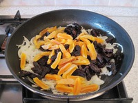 К луку добавьте нарезанные курагу и чернослив, поперчите и жарьте еще 4-5 минут. |