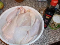 Покупаем курочку любого размера, моем, довольно тщательно солим (снаружи и внутри), перчим, кто как любит, и в конце поливаем соевым соусом, опять-таки - кто как любит. |
