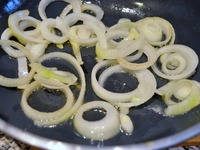 Оставшуюся луковицу режем кольцами и слегка обжарим, этим луком украсим блюдо. В оригинале им просто обильно засыпают маджадра. Дабы показать текстуру блюда я этого не сделала. |