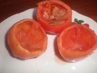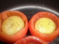 Вбить туда яйцо, аккуратно, чтобы не повредить желток. Ещё немного посолить и поперчить. Выложить помидоры на смазанную маслом форму или сковороду и запекать в духовке при температуре 180 градусов 20-25 минут.