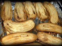 Очистить овощечисткой баклажаны, разрезать пополам и также уложить на противень, запечь при той же температуре, переворачивать не надо, печь до мягкого состояния, я проверяю вилкой. |