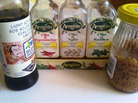 Из оливкового масла с чили и базилика (две разные бутылочки), соевого соуса и горчицы делаем заправку. |
