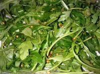 Заправляем рукколу заправкой и перемешиваем, даем ей пропитаться. |